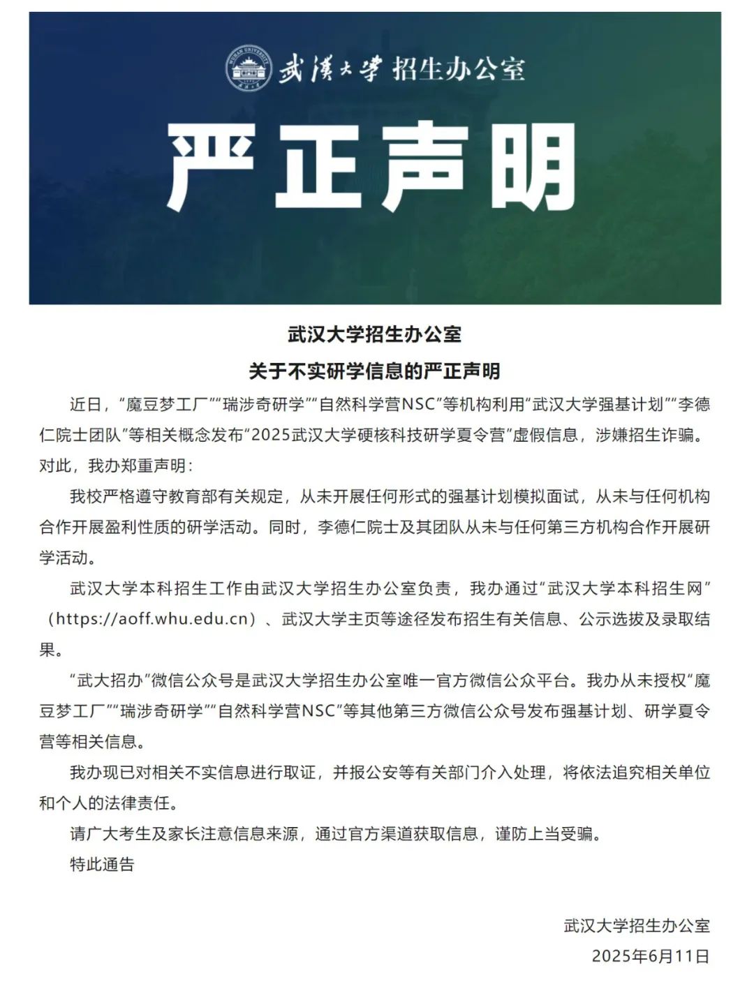 6月11日,武汉大学招生办公室发布严正声明,全文如下: